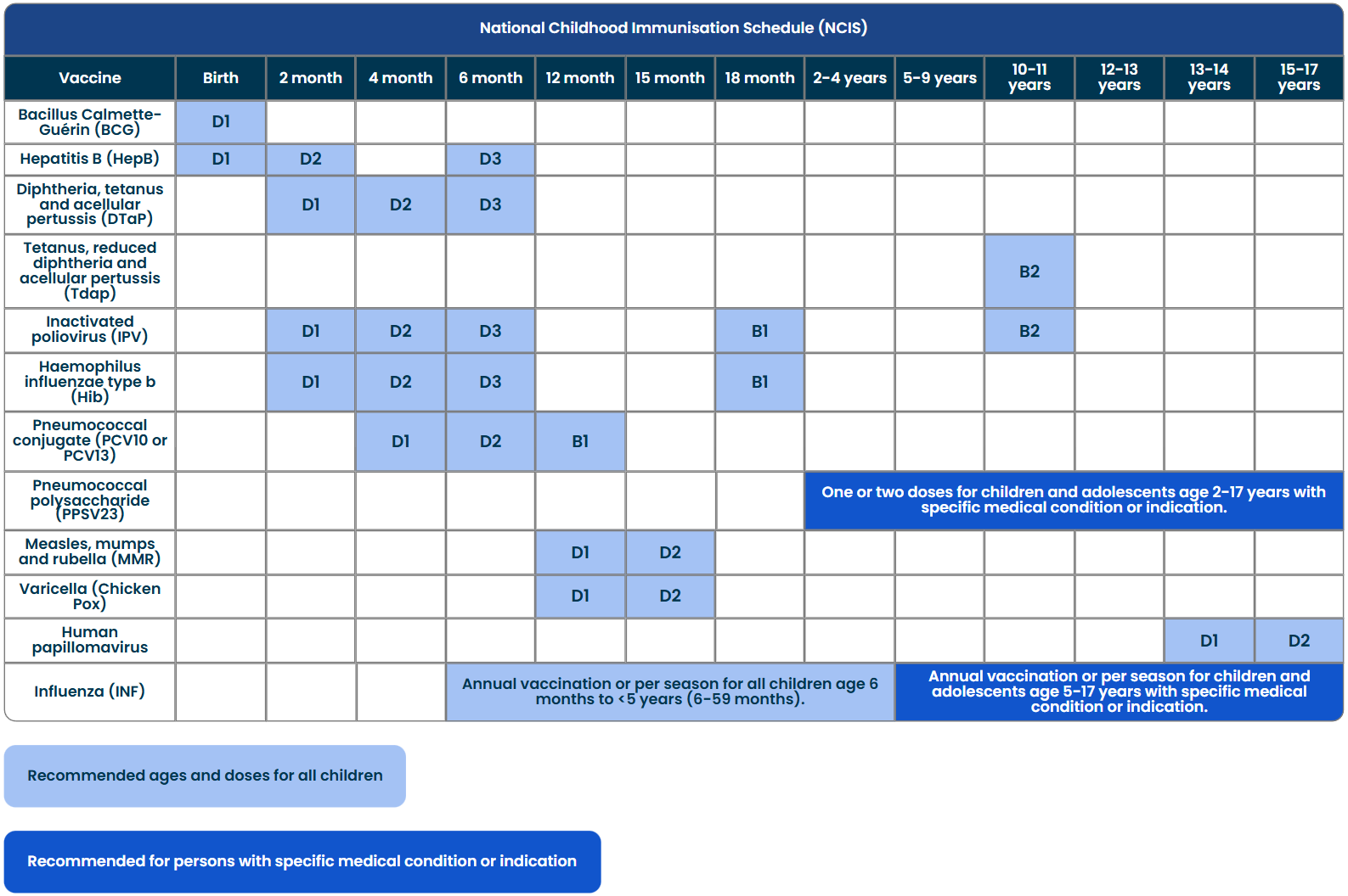 Our package follows the MOH's official National Childhood Immunisation Schedule (NCIS) timeline.
